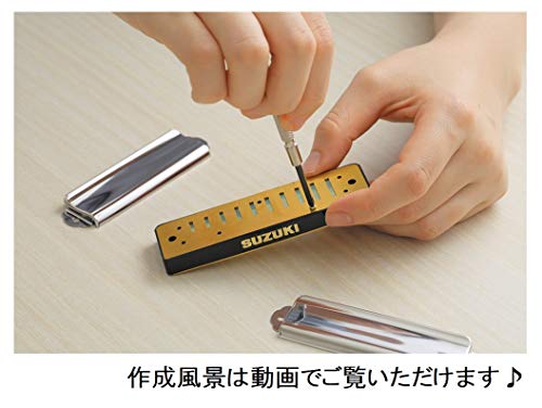 上の画像はズズキのブルースハープの組み立てキットです。ハーモニカはプレートで音が鳴りますが、全音階が1枚もののプレートになっているので、完成品でも組み立て品でもあまり影響がなさそうです。リード部分を曲げでしまうと音程がずれてしまうので注意してください。